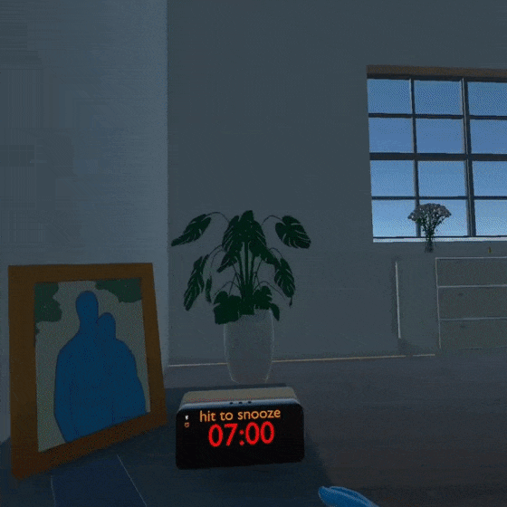 The scene begins with an alarm ringing, triggering the instinctive urge to hit snooze. I implemented the snooze interaction using rigid bodies on both the clock and hand, with a box collider on the clock as the trigger. I wrote a script detects the collision between the clock and hand, shutting off the alarm with haptic and audio feedback while prompting the user to click the photo. I wrote another script that fades out part of the photo to introduce loss.