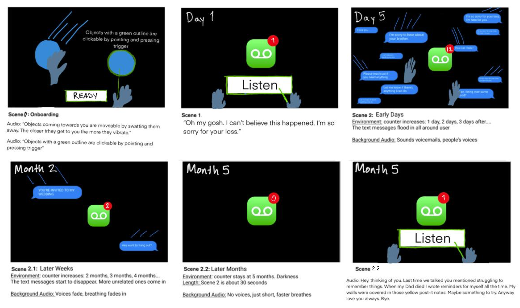 A date counter continuously increases from Day 1 to Month 5. As time passes, the amount of support via texts, calls, gifts, dimishes. The purpose of this scene is to place a user in a point of time (5 months after loss) and to introduce an atmosphere of loneliness and disconnect with the world they once knew.